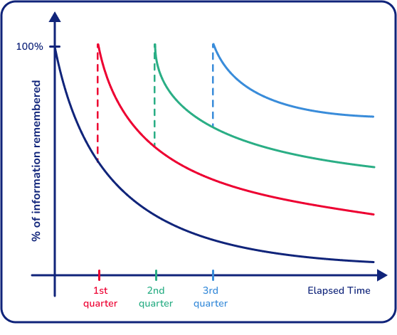 Kidding, The simplest explanation is the longer you go without reviewing something, the more you forget. BUT if you review something just before you're about to forget it, you level up that memory, and it takes even longer to fade the next time.